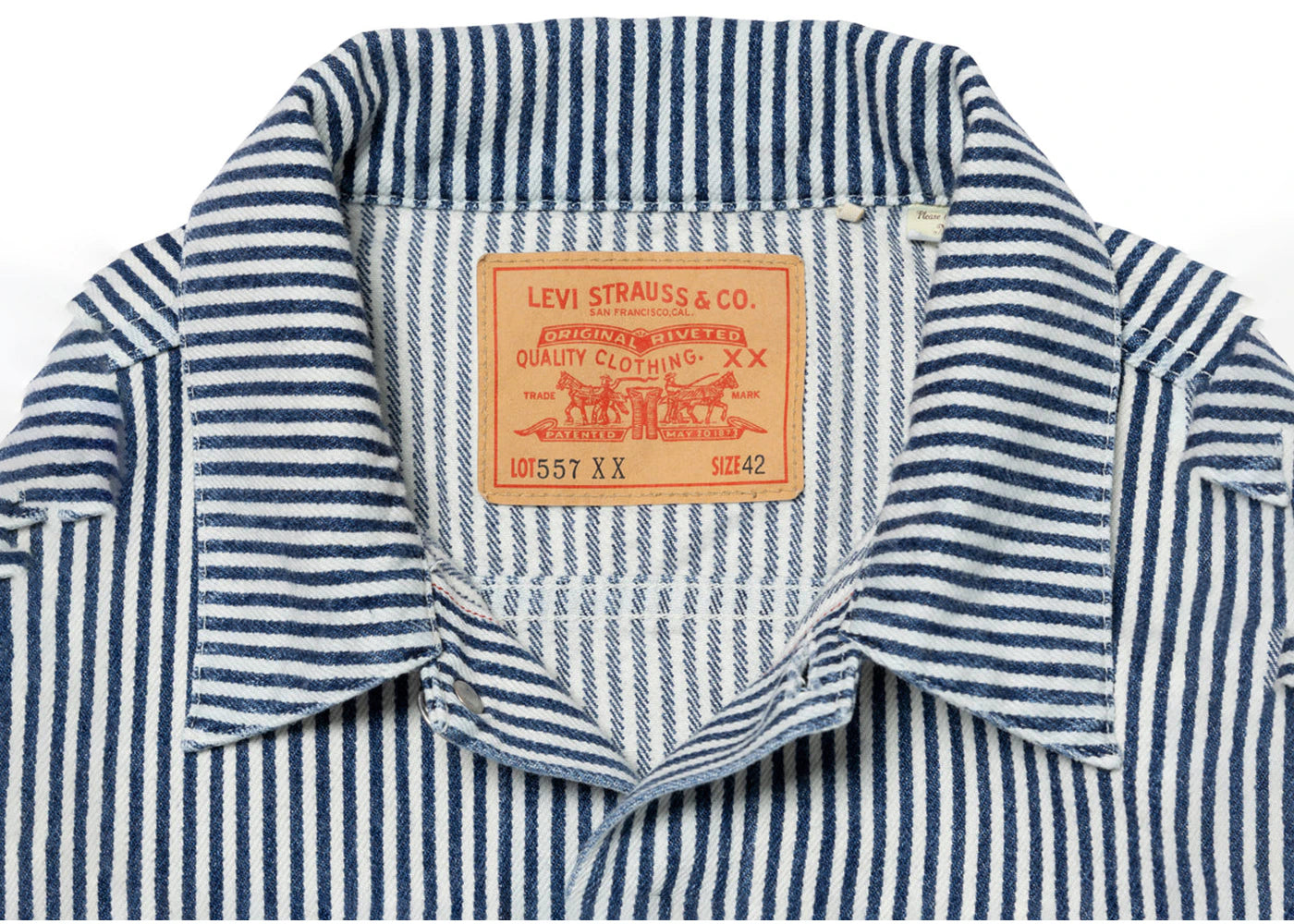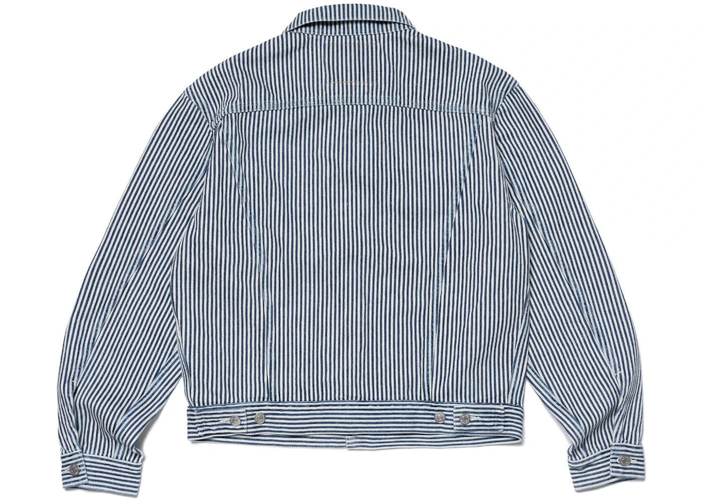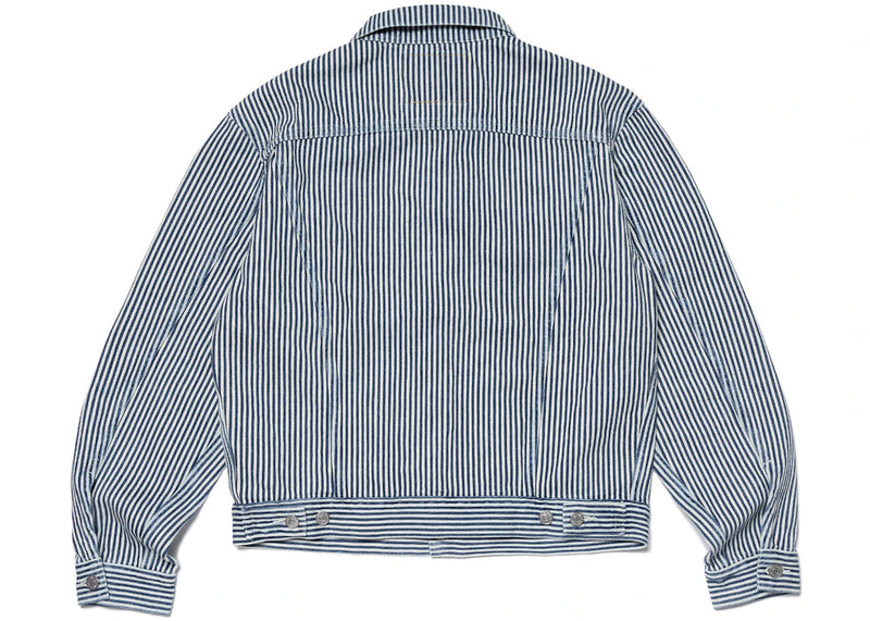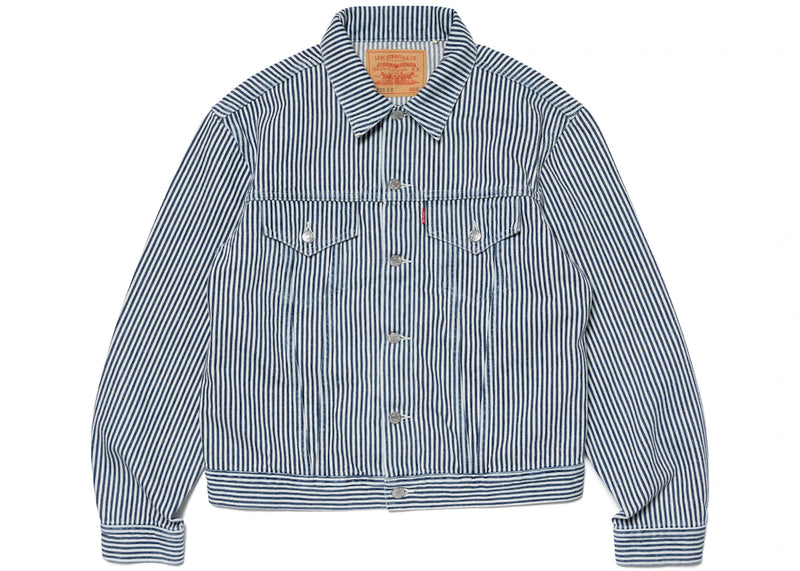 The Levis x Nigo 557XX Hickory Stripe Trucker Jacket Indigo is now available at Side Kicks!