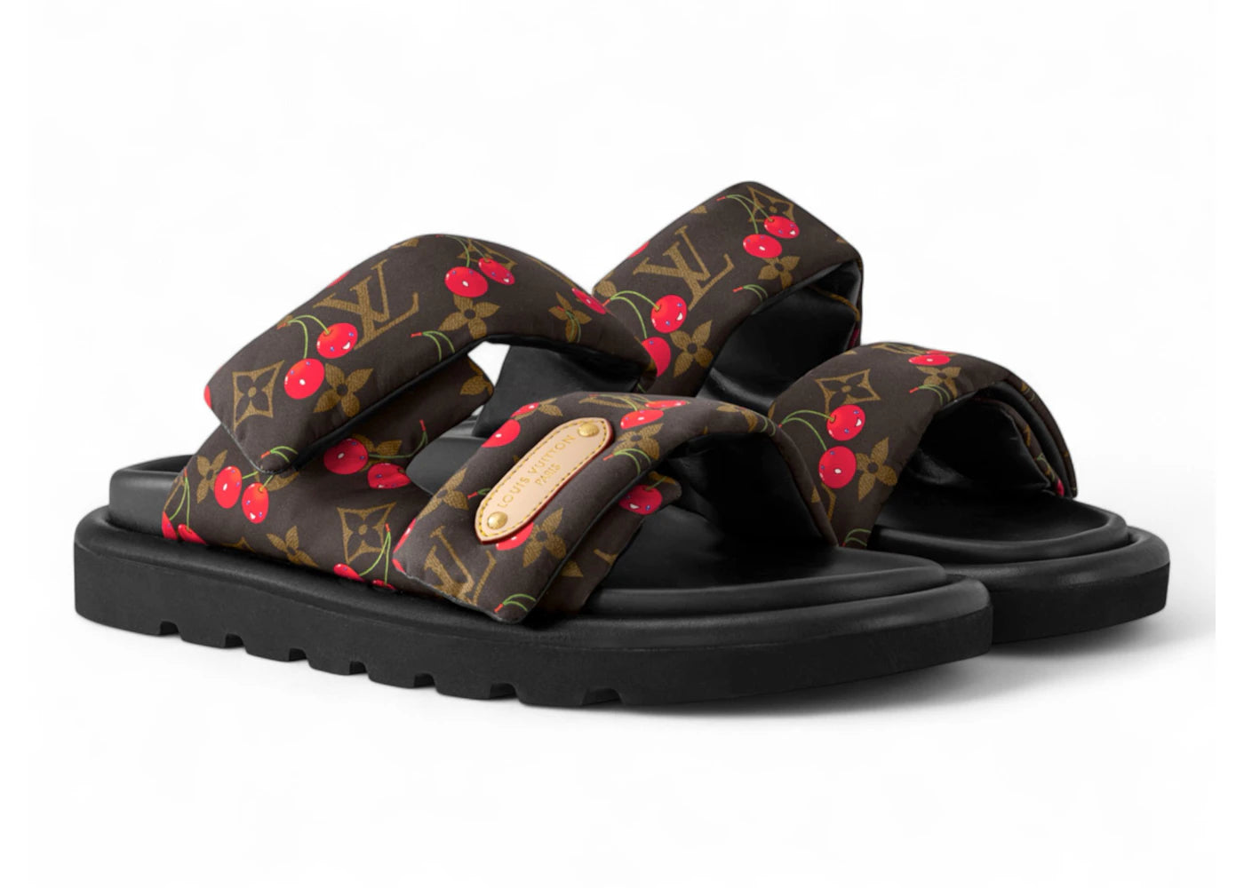 The Louis Vuitton Cherry Pool Pillow Flat Comfort Mule x Takashi Murakami Brown Monogram Cherry is now available at Side Kicks!...