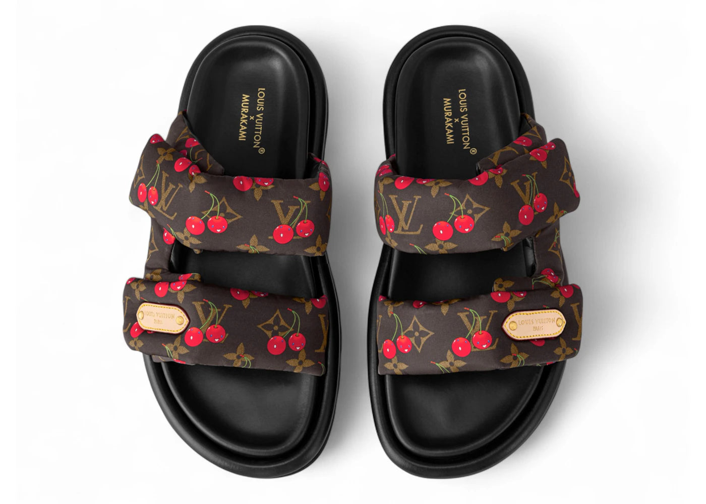 The Louis Vuitton Cherry Pool Pillow Flat Comfort Mule x Takashi Murakami Brown Monogram Cherry is now available at Side Kicks!