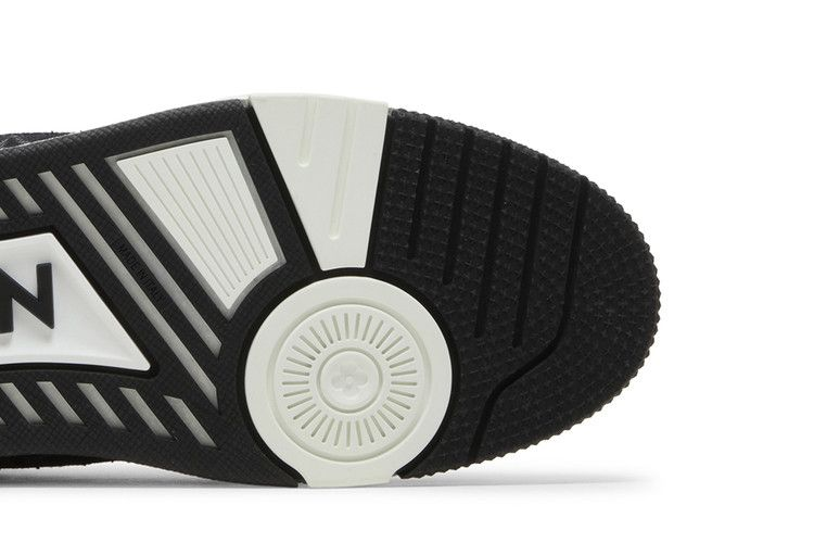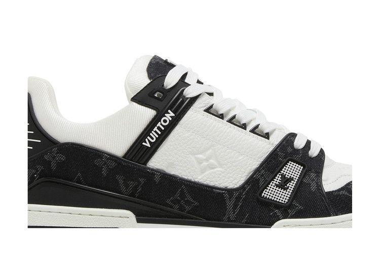 The Louis Vuitton Trainer 'Black Monogram Denim' is crafted from Monogram denim and Monogram-embossed grained calf leather. This stylish model is inspired by vintage basketball trainers, featuring a unique design that harmonizes contrasting colors and materials. Each pair is meticulously stitched, taking seven hours to complete.