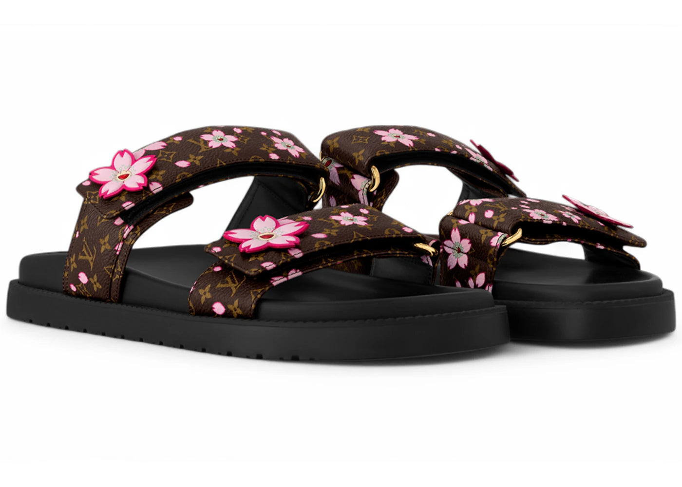 The Louis Vuitton x Takashi Murakami LV Sunset Flat Comfort Mule Cherry Blossom Sakura Brown (Women's) is now available at Side Kicks!...