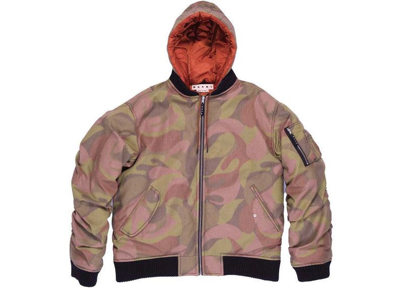The Marni Hooded Bomber Jackets Dusted Olive Camo is now available at Side Kicks!