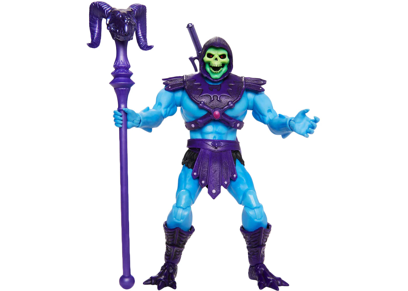 This Masters Of The Universe set includes highly detailed and articulated action figures of He-Man and Skeletor, featuring die-cast weapons and armor. They have double-jointed elbows and knees with a good range of motion. The figures offer 30 points of articulation and come in a seven-inch scale, allowing for dynamic posing and display options.