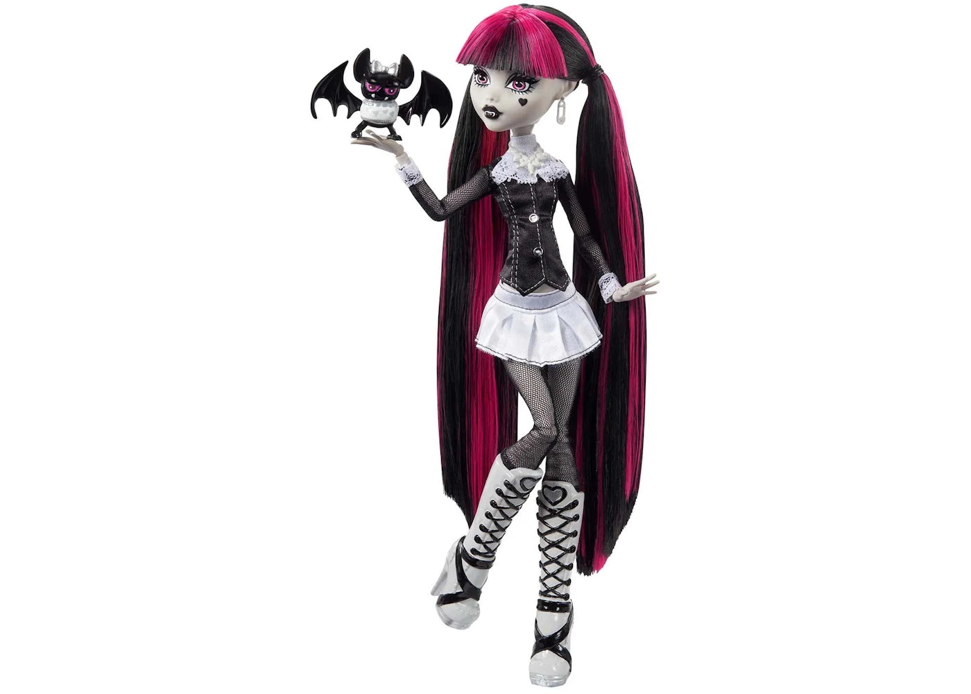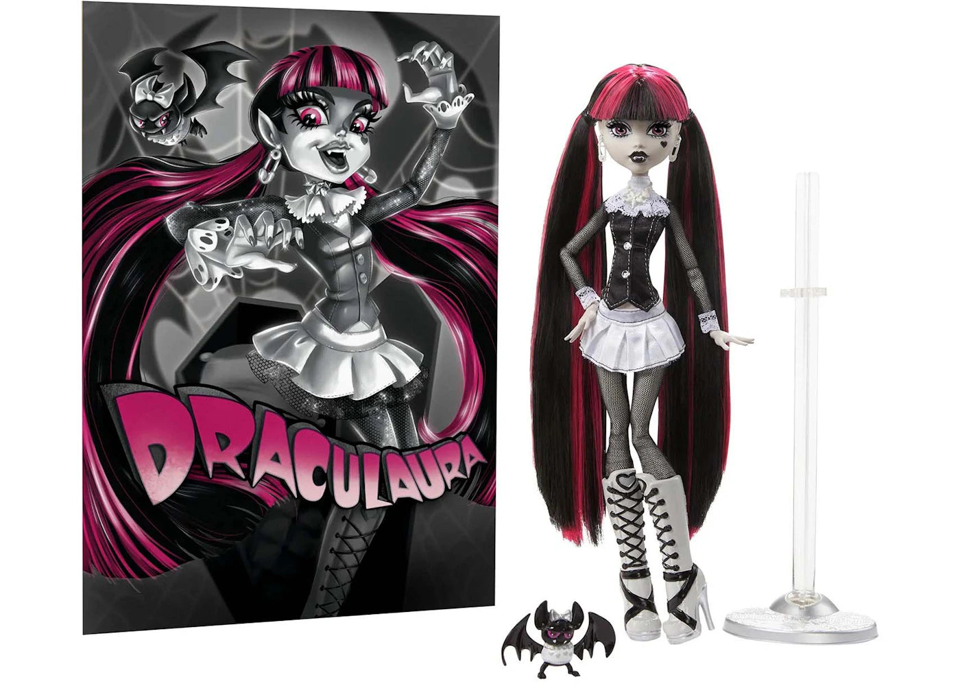 Adorned in a black and white ensemble, this Draculaura Doll figure comes with Count Fabulous, her pet bat, and features two captivating movie posters—one in a mini version and the other in life-size. Other details include spiked accessories, dramatic makeup, and extra-long hair styled in two low pigtails dressed in her signature Pink highlights. The doll comes with a display stand and is posable at the wrists, elbows, and knees.