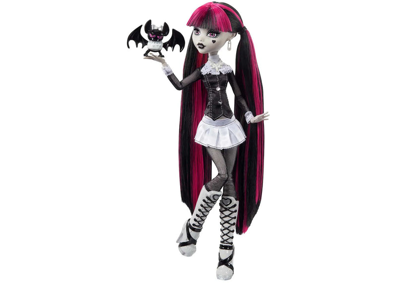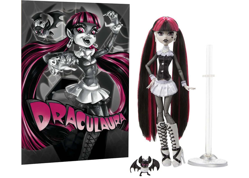 The Mattel Monster High Reel Drama Draculaura Doll features a collectible doll figure of Draculaura, a prominent character in the Monster High franchise released as part of the "Reel Drama" collection, which pays homage to classic black and white horror films.