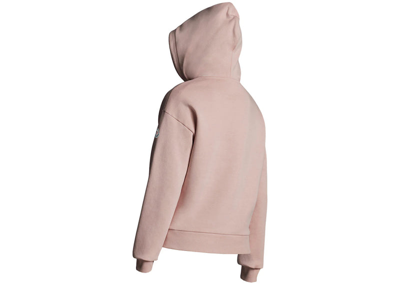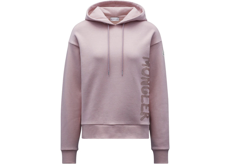 The Moncler Women's Metallic Spray Effect Logo Print Hoodie Petal Pink is now available at Side Kicks!