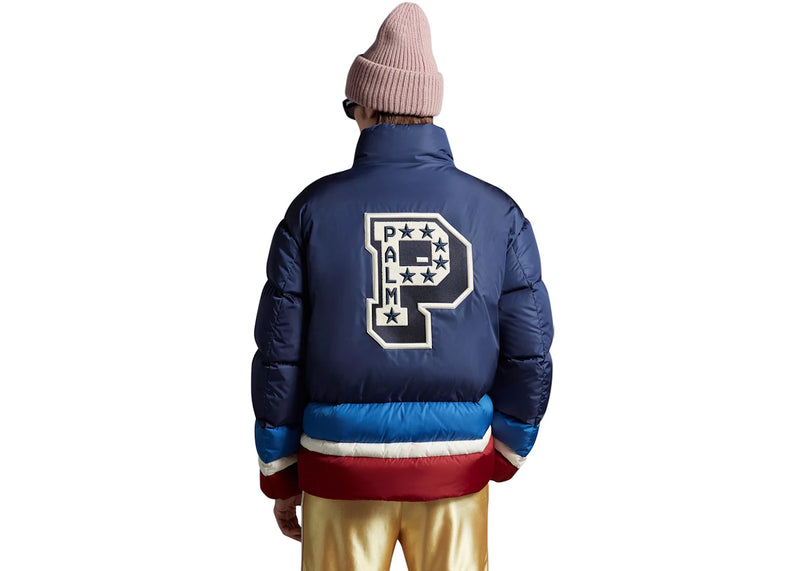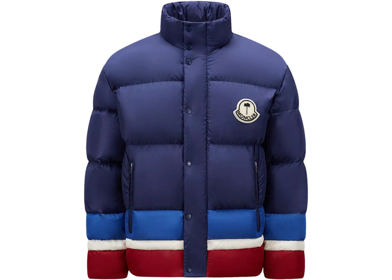 The Moncler x Palm Angels Denneny Short Down Jacket Blue/Burgundy/White is now available at Side Kicks!