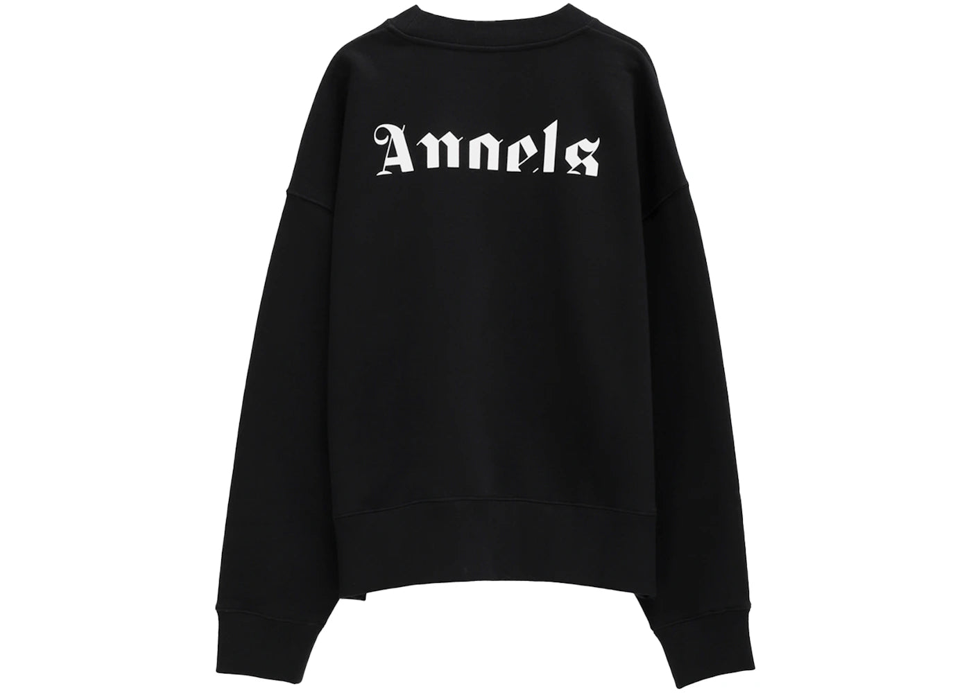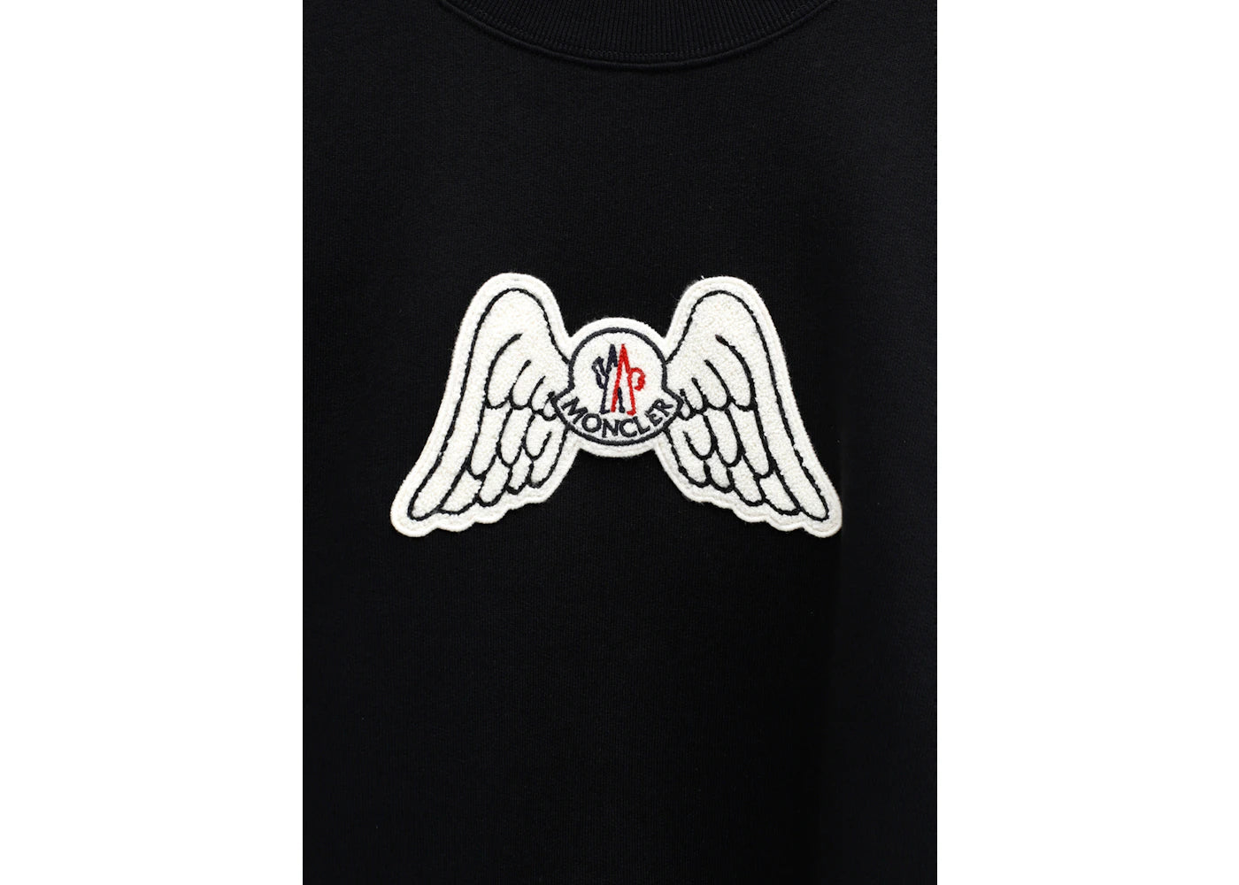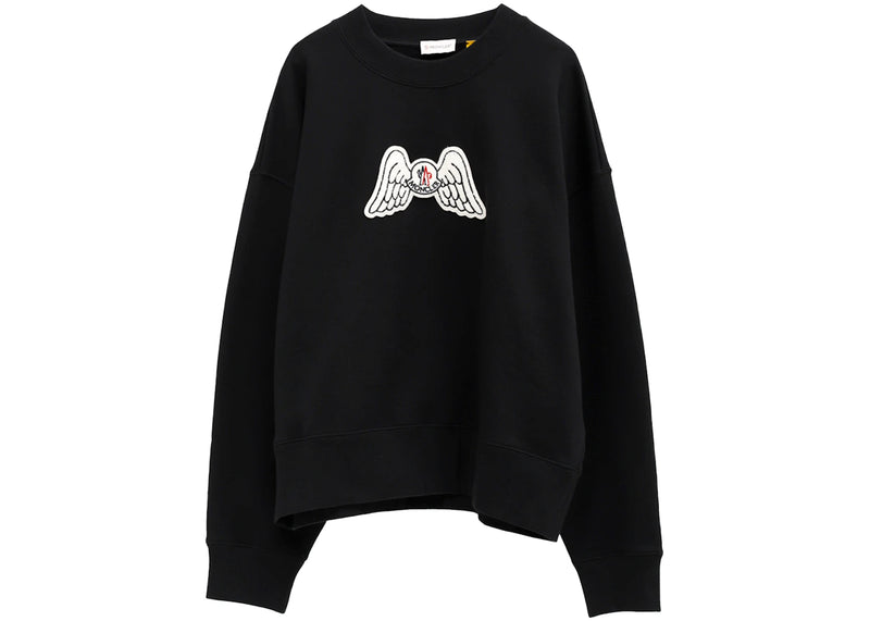 The Moncler x Palm Angels Wings Sweatshirt features a black 100% cotton construction with a winged Moncler logo patch on the chest. The back displays Palm Angels' signature logo. Released...