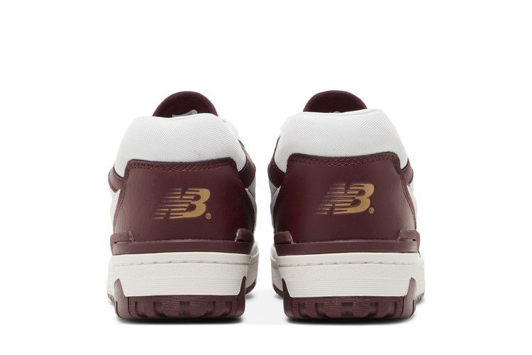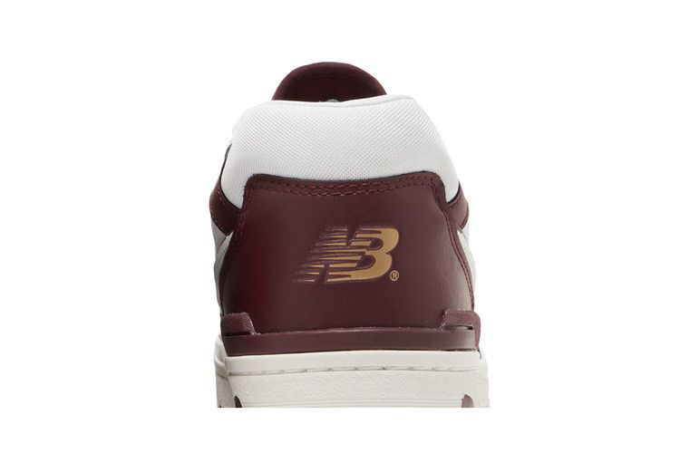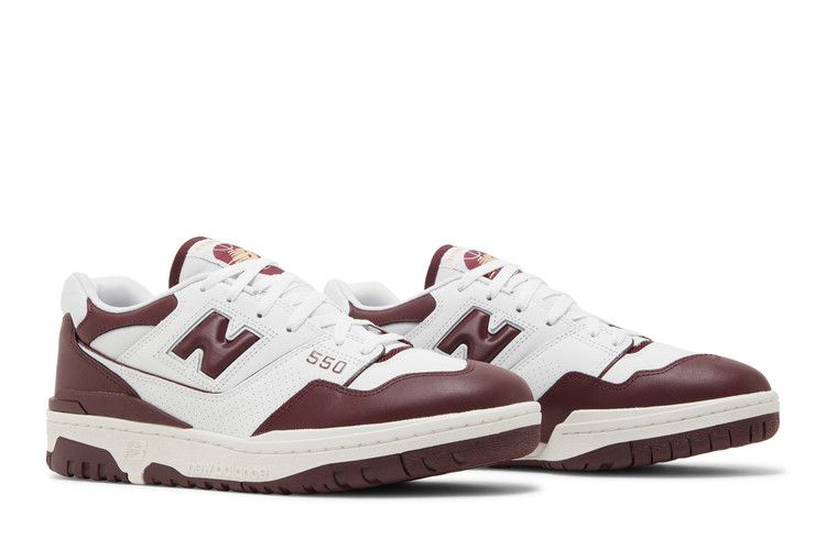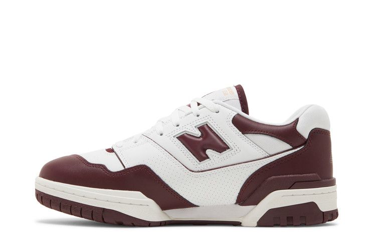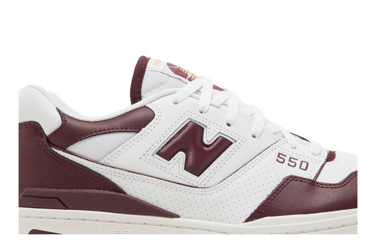 The New Balance 550 Burgundy Cyan has a smooth white leather upper with perforated overlays and burgundy canvas collars. Cyan-trimmed New Balance logos and a mesh tongue complete the design.