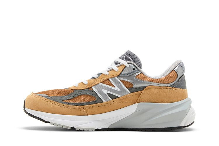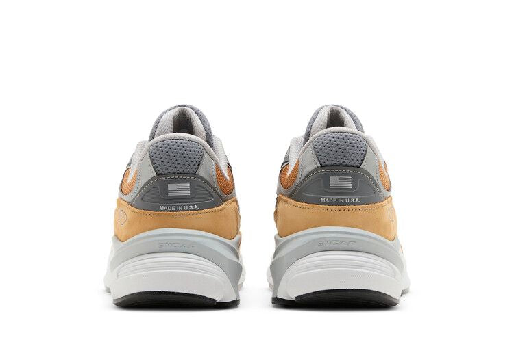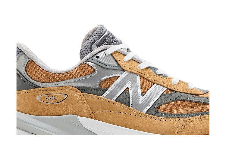 The New Balance 990v6 MiUSA Workwear Grey features a tannish-orange mesh upper with dark-gray perforated leather overlays and suede accents at the eyestays. The ENCAP midsole combines FuelCell foam for cushioning with a polyurethane rim for durability. A black and gray rubber outsole provides traction, while corrugated silvery-gray synthetic details the side panel N logo.
