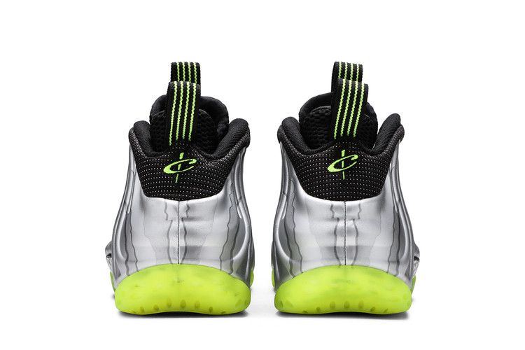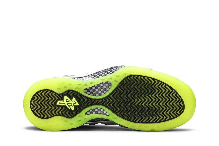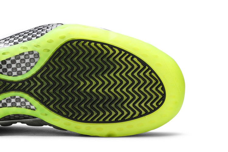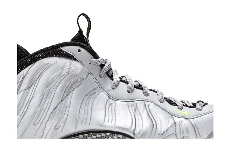 The Nike Air Foamposite One Silver Volt Camo features a molded Foamposite upper made from polyurethane for a secure fit. The silver upper includes 3M reflective details on the collar and eyelets, with black accents on the tongue and laces. Volt Green highlights appear throughout, including the full-length sole.
