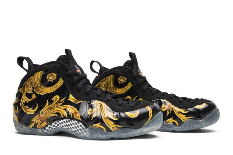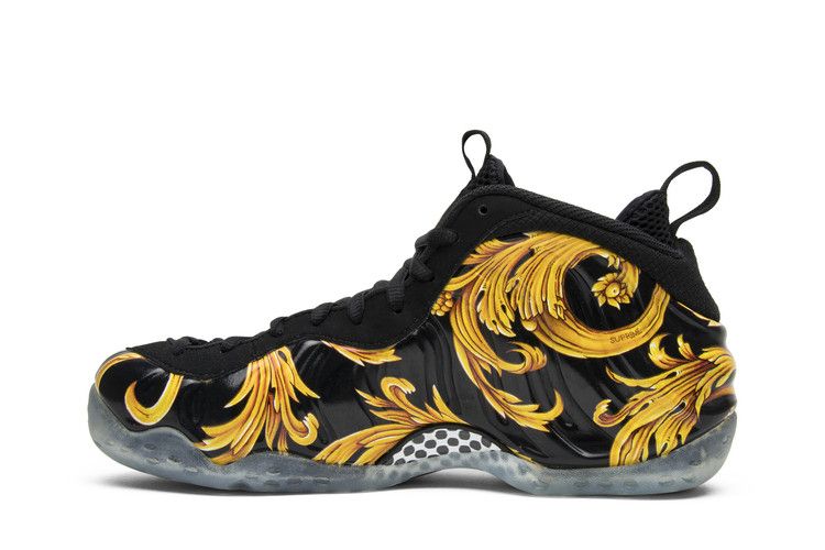 The Nike Air Foamposite One Supreme Black features a black Foamposite upper with gold floral graphics and grooves throughout. Black textile eyestays and tongue provide a secure fit, while pull...