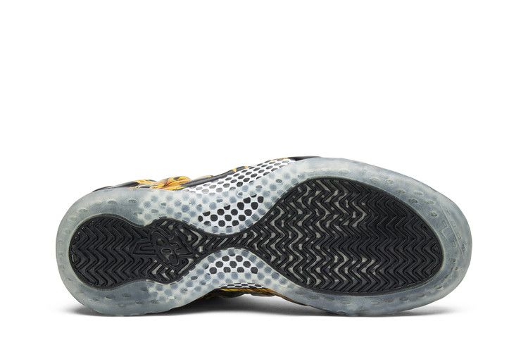 The Nike Air Foamposite One Supreme Black features a black Foamposite upper with gold floral graphics and grooves throughout. Black textile eyestays and tongue provide a secure fit, while pull tabs at the heel and tongue aid in easy wear. The design includes Penny Hardaway 1 Cent branding on the heel and a translucent rubber outsole with air cushioning for responsive bounce. A carbon fiber shank ensures midfoot stability. Subtle Supreme branding appears on the lateral collar, along with a tonal Nike mini Swoosh on the toe box. Released on April 3, 2014, the Nike Air Foamposite One Supreme Black is available now at Side Kicks.