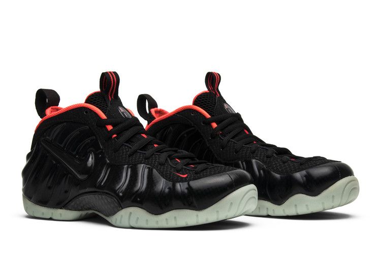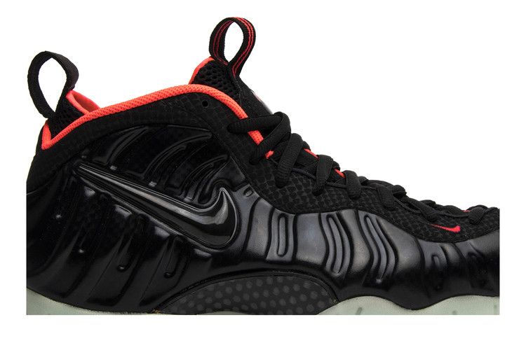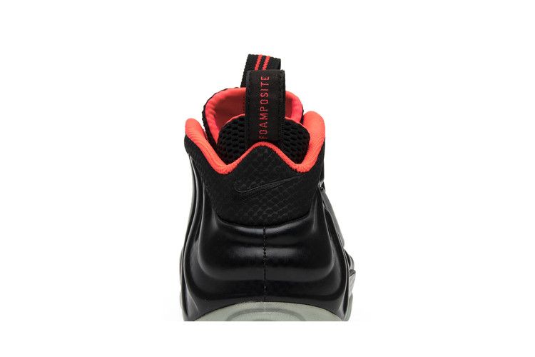 The Nike Air Foamposite Pro Yeezy features a black/laser crimson colorway with carbon fiber prints on the upper. Neon red accents highlight the black upper, complemented by a glow-in-the-dark outsole....