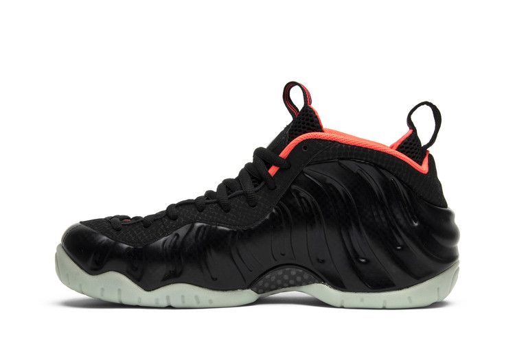 The Nike Air Foamposite Pro Yeezy features a black/laser crimson colorway with carbon fiber prints on the upper. Neon red accents highlight the black upper, complemented by a glow-in-the-dark outsole. Crimson detailing appears on the heel, liner, and tongue, while eyestays showcase a faux snakeskin pattern. The design includes a black Foamposite shell, Swoosh, and mesh/nubuck upper, drawing inspiration from Kanye West's 2012 model. Released on April 19, 2014, the Nike Air Foamposite Pro Yeezy is available now at Side Kicks.