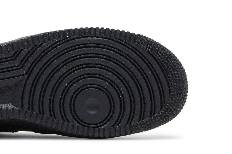 The Nike Air Force 1 Mid '07 LX Halloween (2022) features a mid-top design with a padded collar and an adjustable ankle strap. The leather upper includes dual Swoosh branding, with one side featuring a shadow effect. A rubber outsole with a waffle traction pattern provides grip, while the Air-Sole unit in the foam midsole ensures cushioning. The colorway combines black with Off Noir and Smoke Gray accents.