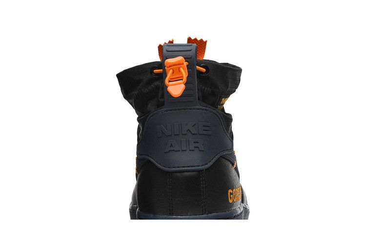 The Nike Air Force 1 Winter Gore-Tex Black Bright Ceramic Thunder Blue features a waterproof Gore-Tex membrane for protection against rain, wind, and moisture. Its rugged outsole ensures traction on slick surfaces, while the high-top design shields feet from the elements. Bright orange Gore-Tex branding and the classic Swoosh logo accent the heel.