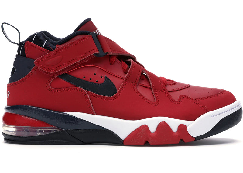 The Nike Air Force Max CB Gym Red features a synthetic leather upper in Gym Red with perforated details and a black Nike Swoosh. Nubuck overlays reinforce the toe box, midfoot, and heel, while a midfoot strap provides added support. White Nike branding appears on the tongue, and the heel displays Nike Air branding with a pull tab featuring the number 4, referencing Charles Barkley’s Houston Rockets jersey. The black and white midsole includes clear Air cushioning in the heel. Released on June 10, 2019, the Nike Air Force Max CB Gym Red is available now at Side Kicks.