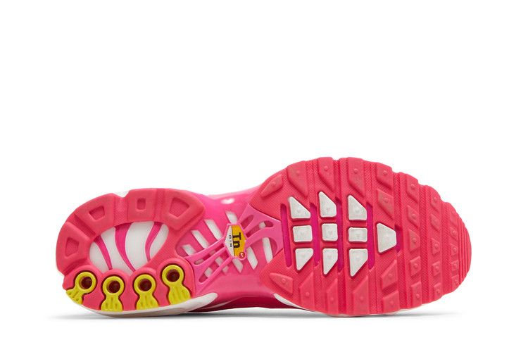 The Nike Air Max Plus Hot Pink White (Women's) features a mesh upper in hot pink with a tonal plastic cage inspired by palm trees. Synthetic overlays on the mudguard and heel add structure, while a white-outlined Swoosh and yellow Tuned Air patch provide contrast. The midsole includes a hot pink midfoot plate and visible pink-tinted Max Air units for cushioning, paired with a hot pink rubber outsole.