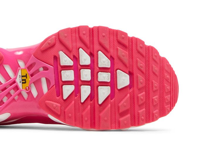 The Nike Air Max Plus Hot Pink White (Women's) features a mesh upper in hot pink with a tonal plastic cage inspired by palm trees. Synthetic overlays on the mudguard...