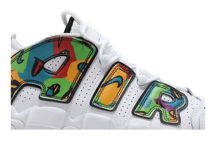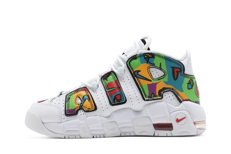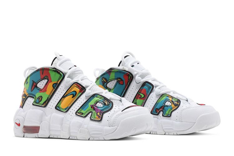 The Nike Air More Uptempo Peace, Love, Swoosh (GS) features a vibrant psychedelic pattern with "AIR" lettering on the sides, inspired by 60s and 70s aesthetics. Built for durability, it includes an Air-Sole unit for all-day comfort. Released on September 10, 2021, the Nike Air More Uptempo Peace, Love, Swoosh (GS) is available now at Side Kicks.