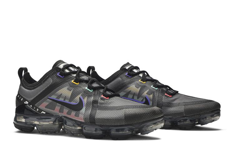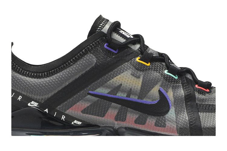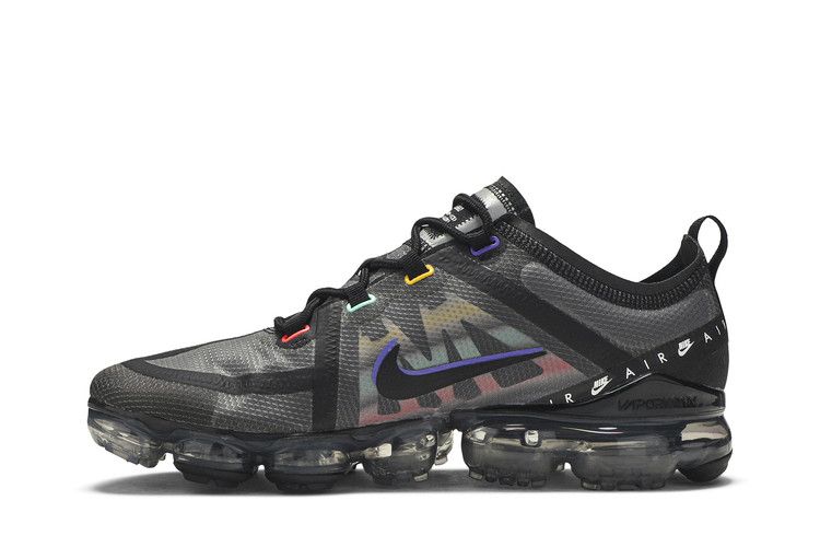 The Nike Air VaporMax 2019 Windbreaker features a multi-color design with black, Psychic Purple, Flash Crimson, University Gold, and Kinetic Green accents. It includes VaporMax Air cushioning with individual Air units in the outsole, replacing the traditional foam midsole. A durable rubber outsole provides traction, while the synthetic upper has a black lacing system. Released on July 1, 2019, the Nike Air VaporMax 2019 Windbreaker is available now at Side Kicks.