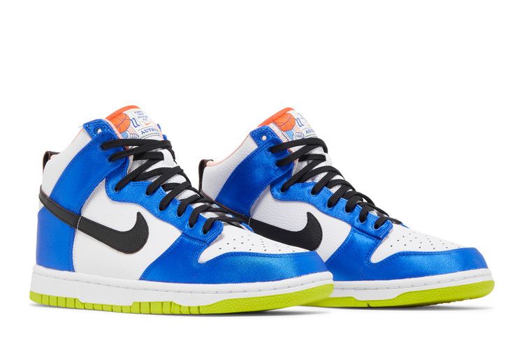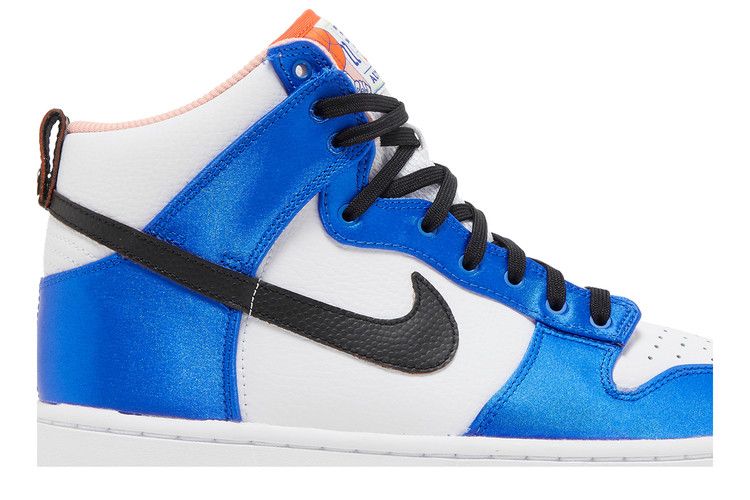 The Nike Dunk High Blue Satin (Women's) features a white leather upper with a textured lizard-like pattern. Blue satin overlays highlight the toe cap, vamp, and collar, while a black...