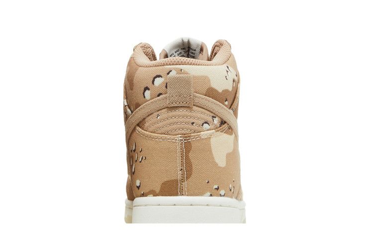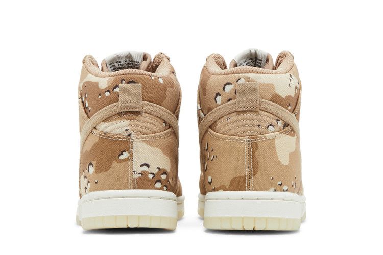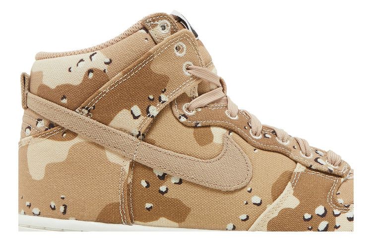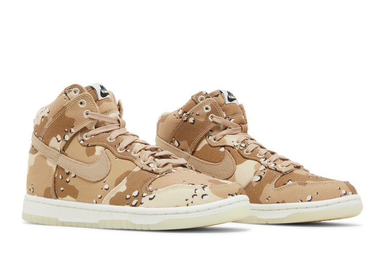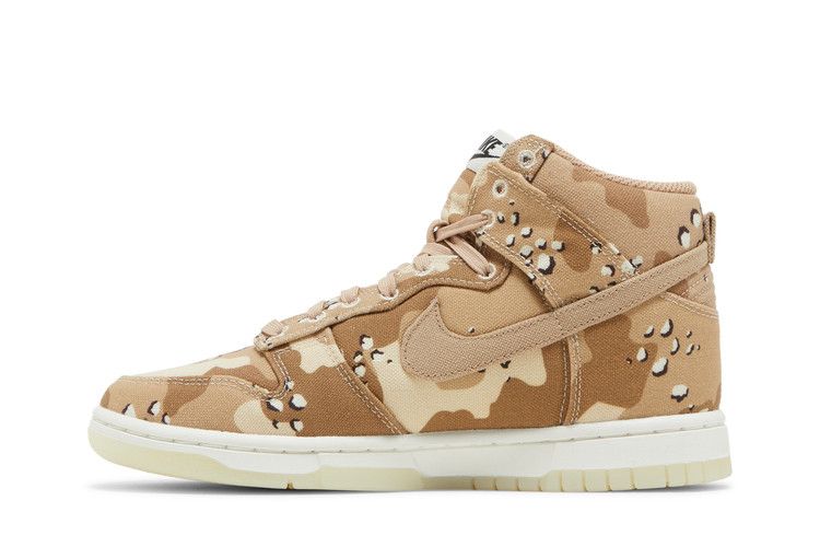 The Nike Dunk High Desert Camo (Women's) features a desert-inspired camouflage pattern in sail and hemp hues. The upper combines manufactured canvas with solid mudguard and vamp construction, accented by...
