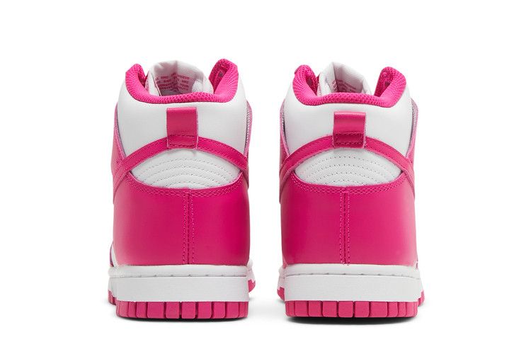 The women's Nike Dunk High Pink Prime (W) has a smooth white leather upper with Pink Prime overlays and Swooshes. It includes a woven Nike tongue label and matching sole....
