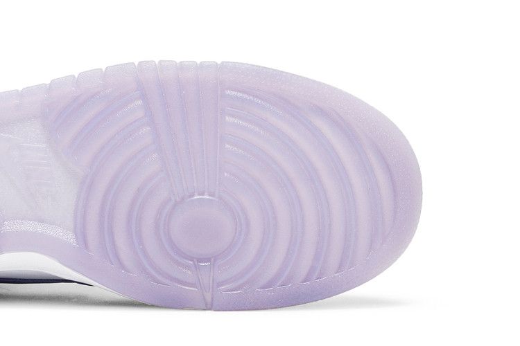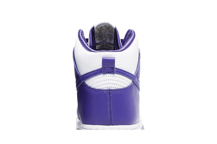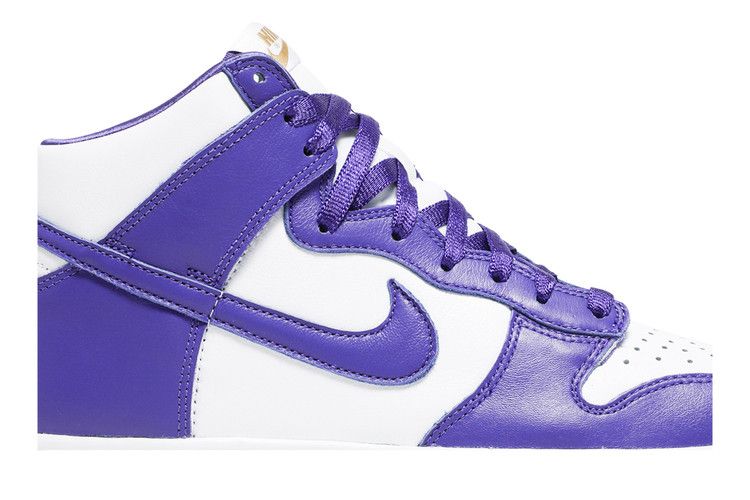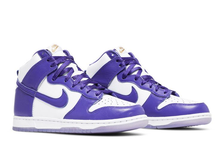 The Nike Dunk High Varsity Purple (W) features a white and purple leather upper with classic color-blocking. It includes a translucent purple outsole and gold embroidered tongue tag, inspired by...