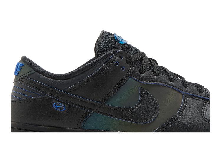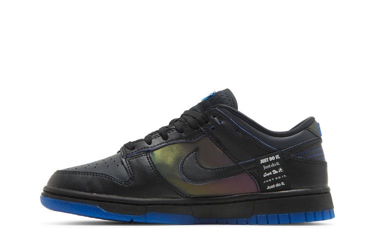 The Nike Dunk Low Black Royal Iridescent (Women's) features a black leather upper with iridescent reflective panels that shift in light. The tongue displays a printed Nike mark, while the heel tab includes matching details. A cushioned midsole provides support, and a rubber outsole ensures traction.