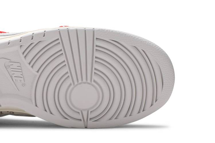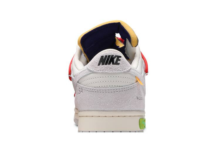 The Nike Dunk Low Off-White Lot 13 is part of the 'Dear Summer' collection, a sequel to Virgil Abloh's initial Nike Dunk collaboration. This low-top sneaker boasts a white leather upper with grey suede overlays and signature Off-White details like a plastic zip tie and printed Helvetica text. Additional pops of color come from the habanero red secondary lacing system, zip tie, exposed foam tongue, and a "13 of 50" badge on the lateral midsole. Limited to just fifty pairs, this exclusive design is a must-have for sneaker enthusiasts.