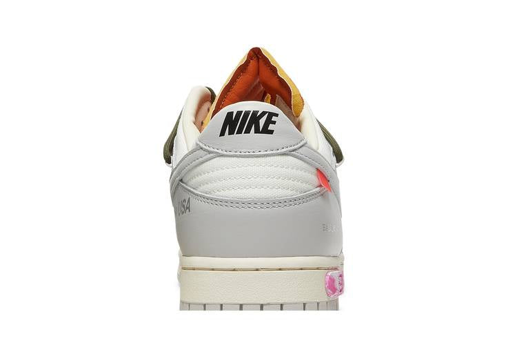 The Nike Dunk Low Off-White Lot 22 is part of the ‘Dear Summer’ collection by Virgil Abloh. This low-top sneaker features a white leather upper with grey canvas overlays and signature Off-White details such as a plastic zip tie and printed Helvetica text. The shoe also includes contrasting pops of color with secondary lacing system, zip-tie, exposed-foam tongue, and a rectangular tab on the Swoosh. Limited to fifty pairs, the ‘22 of 50’ badge is displayed on the lateral midsole.