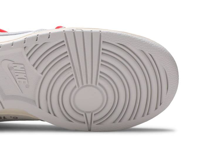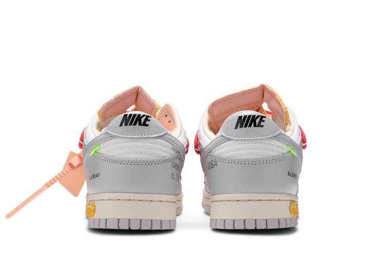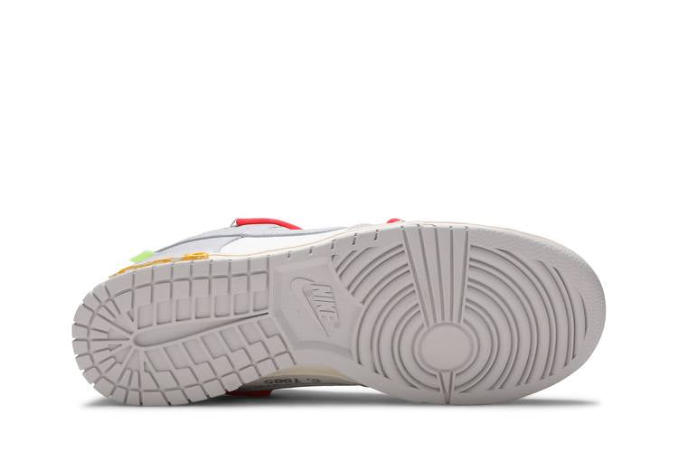 The Nike Dunk Low Off-White Lot 6 is a limited-edition collaboration between Nike and Off-White. Featuring a white leather upper with grey canvas overlays, this low-top sneaker includes signature Off-White design elements such as a plastic zip tie, printed Helvetica text, and contrasting pops of color. The shoe also showcases a secondary lacing system, exposed-foam tongue, and a rectangular tab on the Swoosh. Limited to fifty pairs, each shoe is marked with a '6 of 50' badge on the lateral midsole.