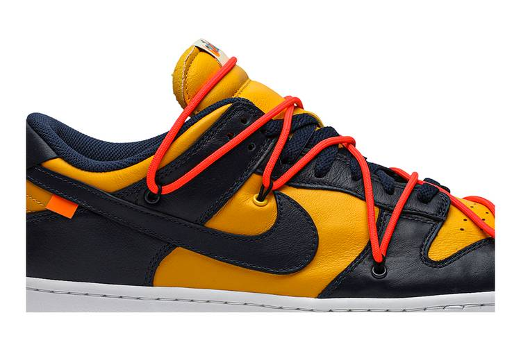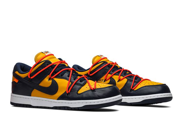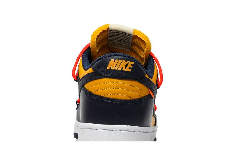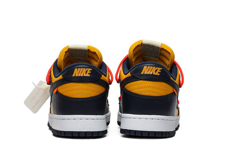 The Nike Dunk Low Off-White University Gold features a university gold and navy leather upper with signature Off-White details such as an orange flag label on the Swoosh and enlarged...