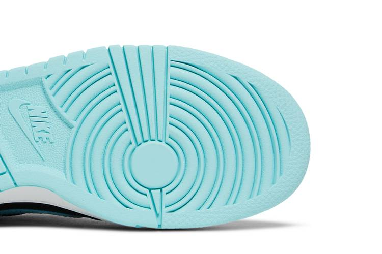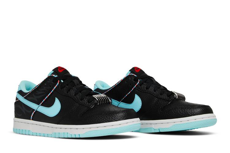 The Nike Dunk Low SE Barber Shop Black (GS) is part of the 'Barber Shop' pack, paying tribute to barber shop artistry. Crafted with a black tumbled leather upper and aqua Swoosh, inspired by hair clippers. Features metallic silver lace dubrae, multicolor heel overlay piping, and crimson Nike branding. Designed with toebox perforations, aqua sock liner, and a white midsole with vulcanized cupsole for traction. Perfect for grade school-aged kids, this shoe was released on June 17, 2022.