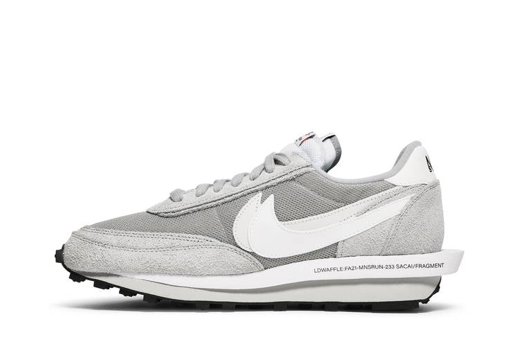 The Nike LD Waffle SF sacai Fragment Grey is a collaborative sneaker featuring a grey mesh upper with double-stacked tonal suede overlays and white leather Swooshes. The shoe includes printed branding on the midsole and a waffle-traction rubber outsole for grip. Released in August 2021, this sneaker combines elements from the Nike LDV and Waffle Racer in a unique design collaboration between sacai, Fragment Design, and Nike.
