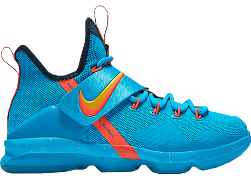 The Nike LeBron 14 "Cocoa Beach" features a blue lagoon upper with yellow and crimson accents, paired with a squadron blue liner. Design details include "Cocoa Beach" callouts on the...