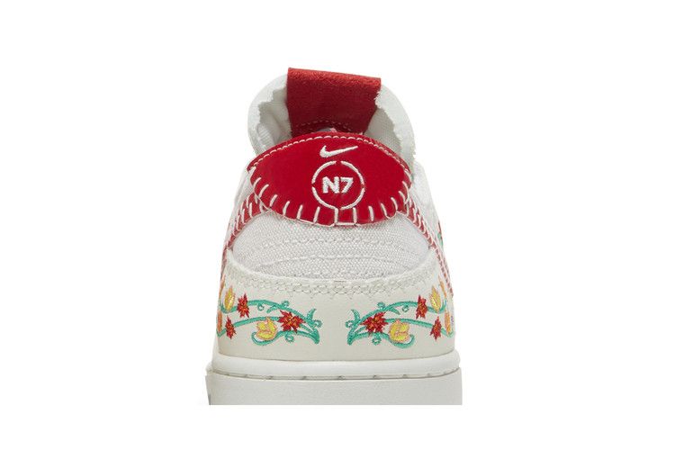 The Nike SB Dunk Low Decon N7 Opti Yellow University Red features a white canvas upper with floral embroidered suede overlays and an exposed-foam tongue. The design includes a red...
