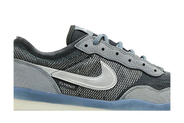 The Nike SB PS8 Cool Grey features a Flyknit fabric and leather upper in Cool Grey, Anthracite, and Wolf Grey. Metallic Silver Swoosh accents, a Flyknit tab, and Nike SB branding on the heel and tongue complete the design. The clear midsole adds a subtle contrast.