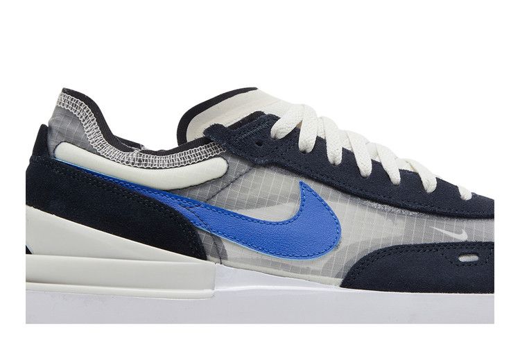 The Nike Waffle One SE Phantom Hyper Royal features a transparent white mesh upper with a crosshatch pattern and visible stitching for a deconstructed look. Black synthetic overlays reinforce key...