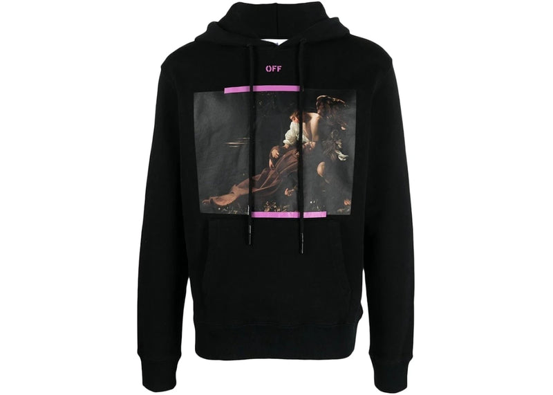 The OFF-WHITE Arrow Caravaggio St. Fran Slim Hoodie Black/Purple/Multi is now available at Side Kicks!