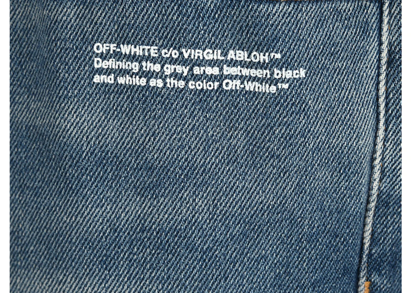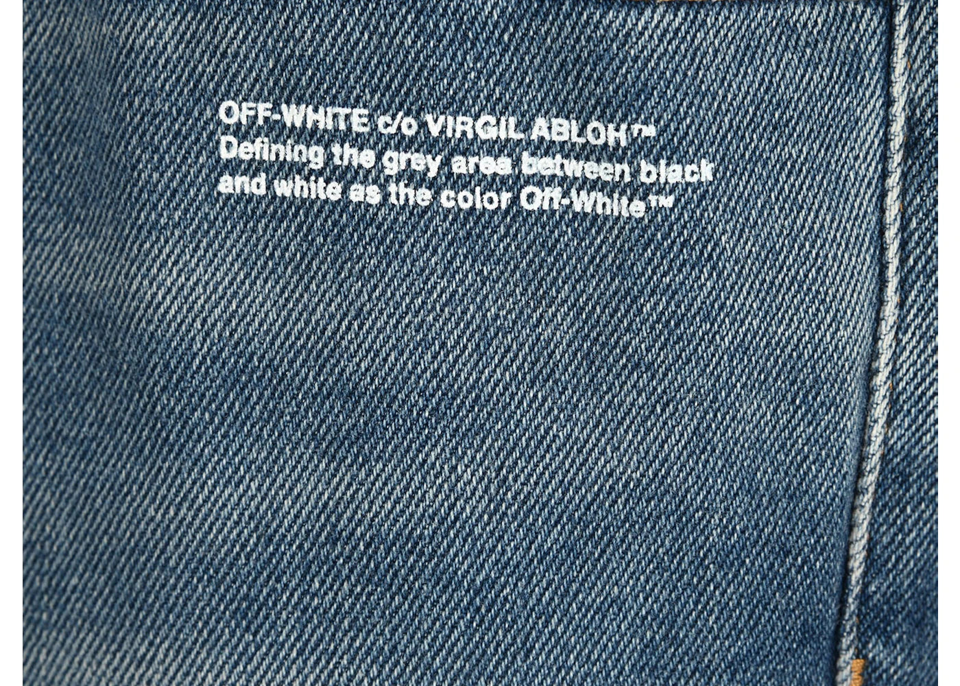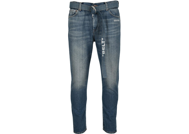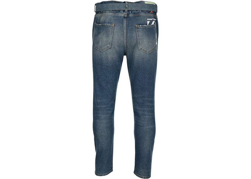 The OFF-WHITE Belted Low Crotch Slim Fit Denim Jeans Medium Blue/White is now available at Side Kicks!