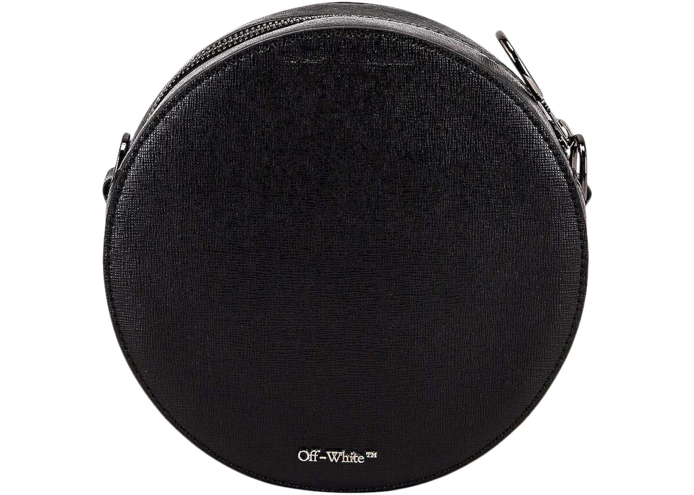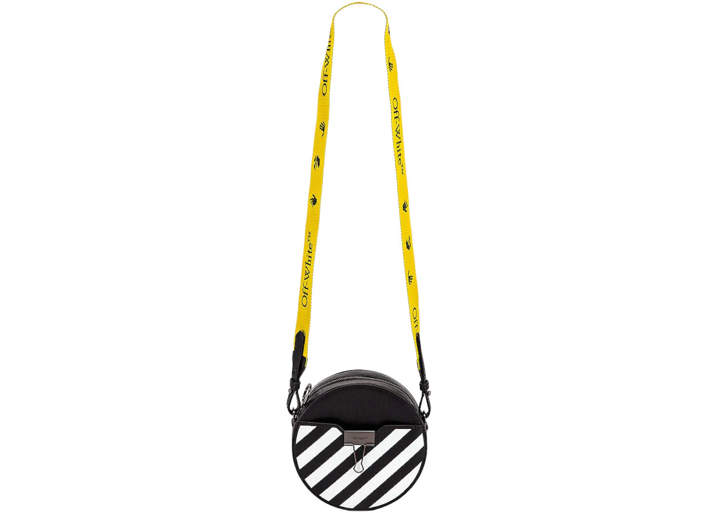 The OFF-WHITE Diag Round Bag Black/White with Yellow Strap is now available at Side Kicks!