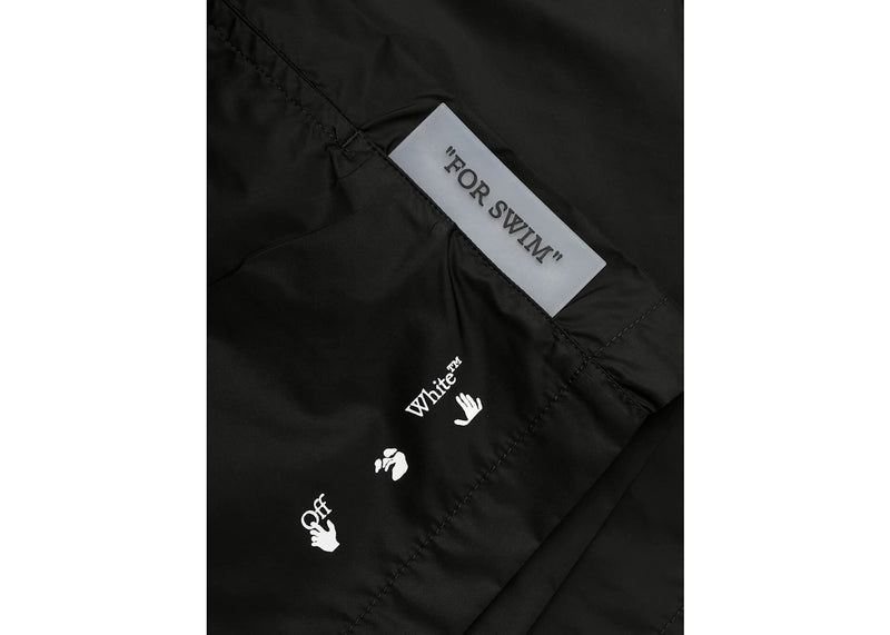 The OFF-WHITE Logo Print Quote Motif Swim Shorts Black is now available at Side Kicks!