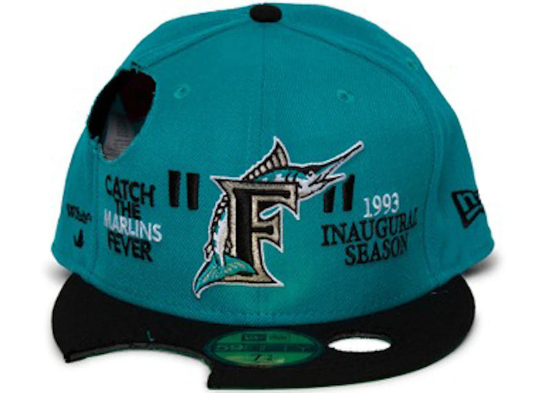 The OFF-WHITE New Era Miami Marlins Fitted Hat Lake Blue/Black is now available at Side Kicks!