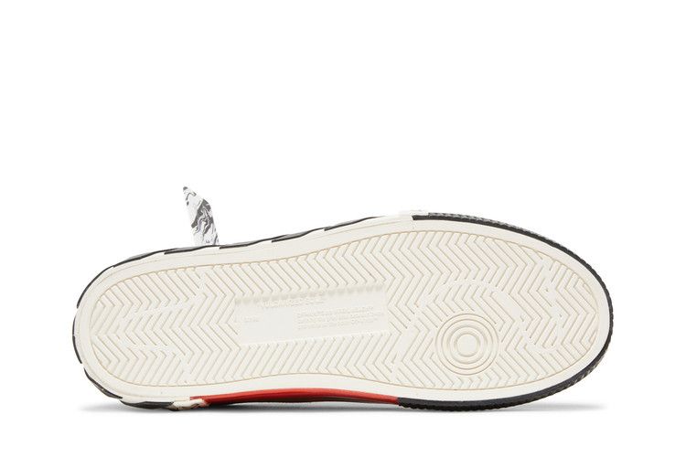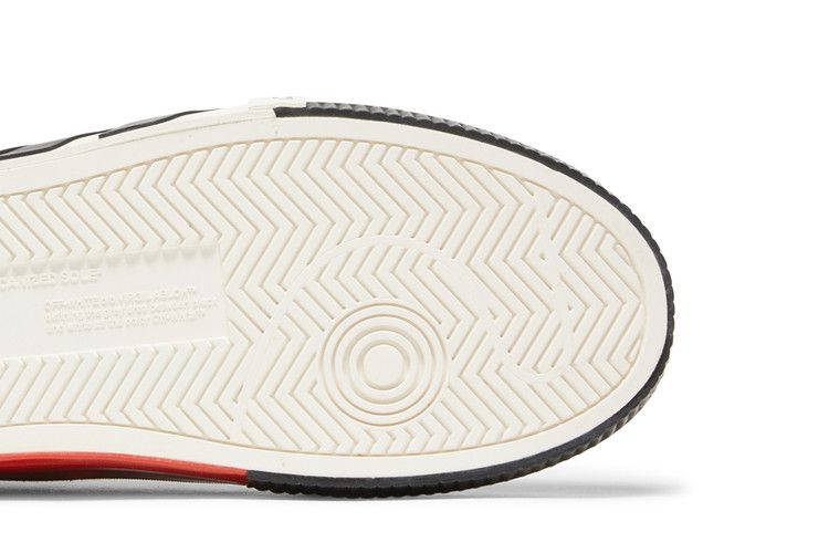 The OFF-WHITE Vulc Low Black White Arrow SS21 features a vulcanized rubber sole with 3D black diagonal stripes and a transparent red rubber rectangle. The upper combines fabric or suede...