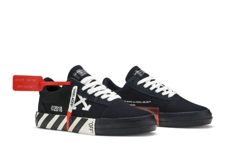 The OFF-WHITE Vulc Low Updated Stripes Black (Women's) features a black textile and suede upper with white laces, tongue branding, and a red signature zip tie. White intersecting arrows adorn...