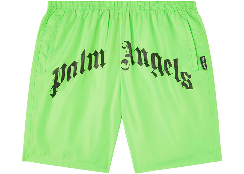 The Palm Angels Curved Logo Bold Swim Shorts Green Fluo/Black is now available at Side Kicks!