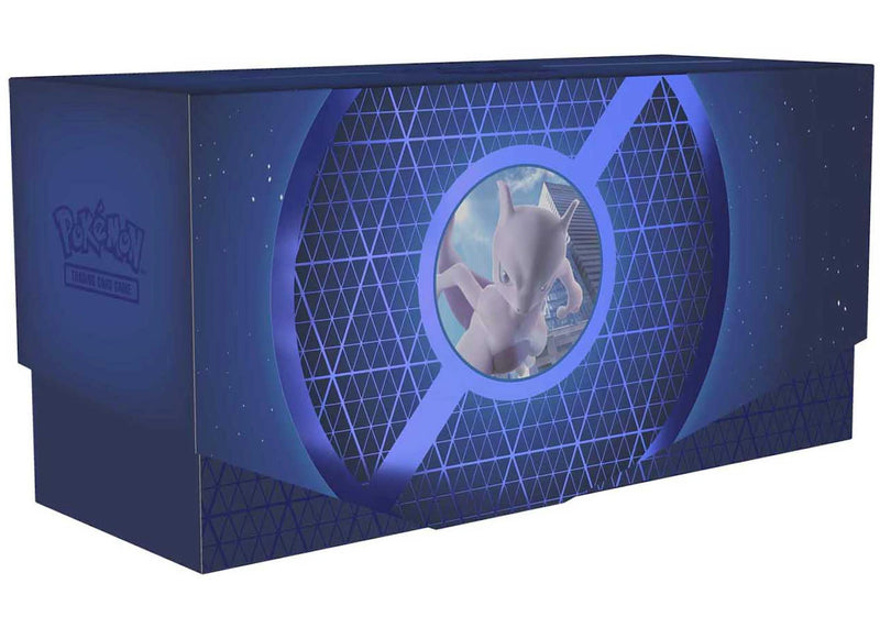 The Pokémon TCG Pokémon Go Pokémon Center Elite Trainer Box Plus contains 12 Pokémon TCG: Pokémon GO booster packs, 65 card sleeves featuring Mewtwo, one full-art Mewtwo V foil promo card, one deck box featuring Mewtwo 45 Pokémon TCG Energy cards, a collector's box to hold everything, with four dividers to keep it organized, a code card for Pokémon Trading Card Game Live, a player's guide to the Pokémon GO expansion, one metal coin, two metal condition markers, one acrylic VSTAR marker, a Pokémon TCG rulebook, and six metal damage-counter dice.